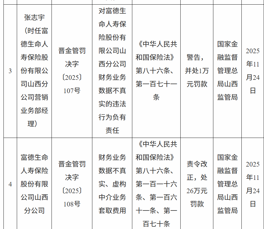 12月2日杭州配资平台有哪些,国家金融监督管理总局山西监管局行政处罚信息公开表显示,富德生命人寿保险股份有限公司山西分公司因财务业务数据不真实、虚构中介业务套取费用被责令改正并26万元罚款;赵某被警告并处1万元罚款;苏某韩被警告并处3万元罚款;张某宇被警告并处1万元罚款。